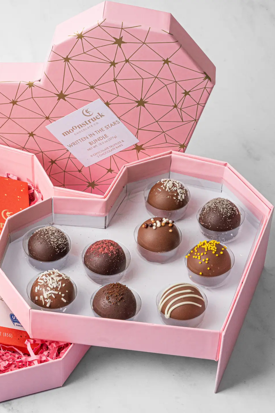 Enjoy this Valentine's Day box featuring truffles & chocolate bars: A Love Story in Every Bite! Moonstruck Chocolate Co.'s Written In The Stars Bundle is packaged in a heart shaped box that contains two layers. Find nine Moonstruck truffles on the top layer, on the bottom layer you will find two Moonstruck chocolate bars, flavors may vary from chocolate bars shown in photos.